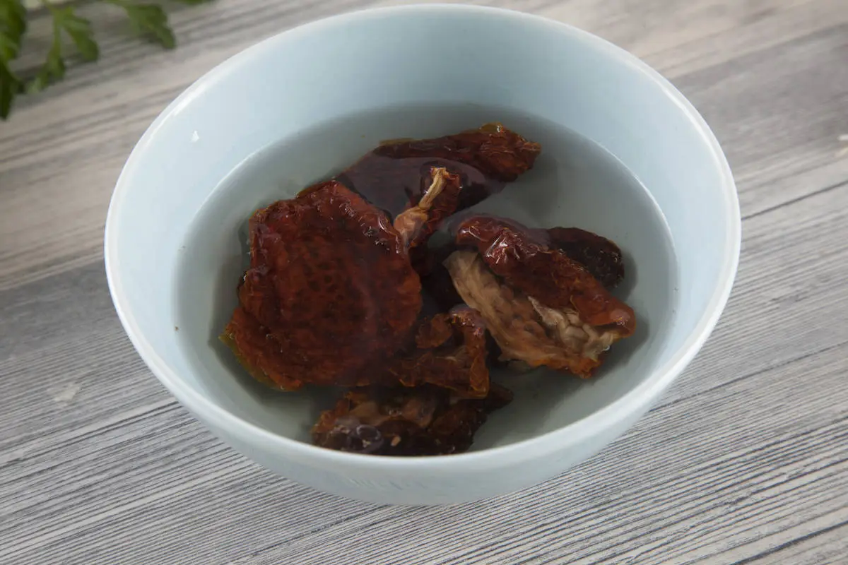 Сушеные томаты залейте небольшим количеством кипятка и оставьте на 10 минут (если вы используете вяленые томаты в масле, то этот шаг пропустите).