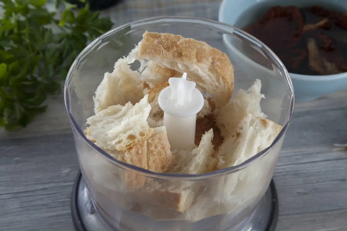 Подсохший хлеб (если хлеб свежий – подсушите в духовке) измельчите в блендере до мелкой крошки, выложите в глубокую миску.
