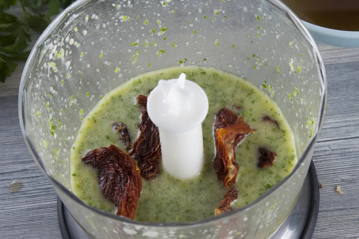 С половины лимона снимите цедру и выжмите сок, сок вылейте в чашу блендера, добавьте оливковое масло, цедру, чеснок, соль, перец и петрушку, пробейте в блендере, затем добавьте помидоры (без воды) и еще раз пробейте в блендере, не измельчайте помидоры совсем, пусть останутся небольшие кусочки.