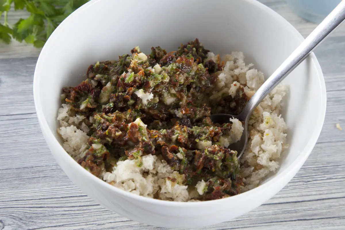 Получившуюся смесь вылейте на сухари, перемешайте, если получилось суховато, добавьте еще лимонного сока.