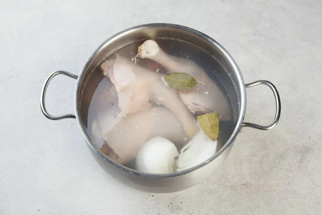 Лук и морковь почистите, добавьте в кастрюлю к окорочкам, посолите, добавьте перец-горошек и лавровый лист. Варите всё вместе до готовности окорочков — около получаса.