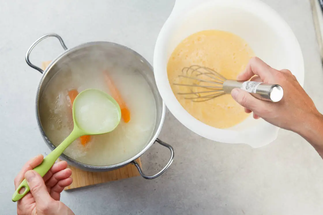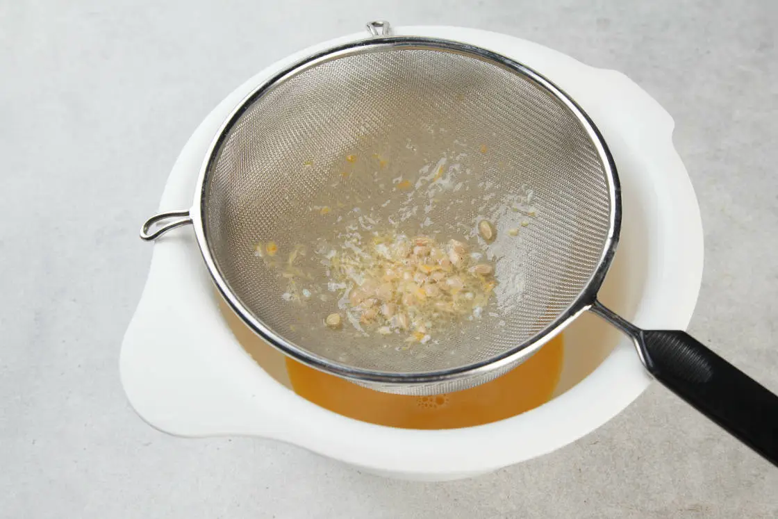 Из лимонов выжмите сок в миску, туда же разбейте яйца. Если лимоны очень крупные или слишком кислые — используйте только два. Хорошо перемешайте лимонный сок с яйцами и процедите через сито, чтобы избавиться от косточек и неразмешанных кусочков белка.