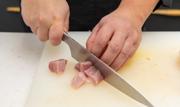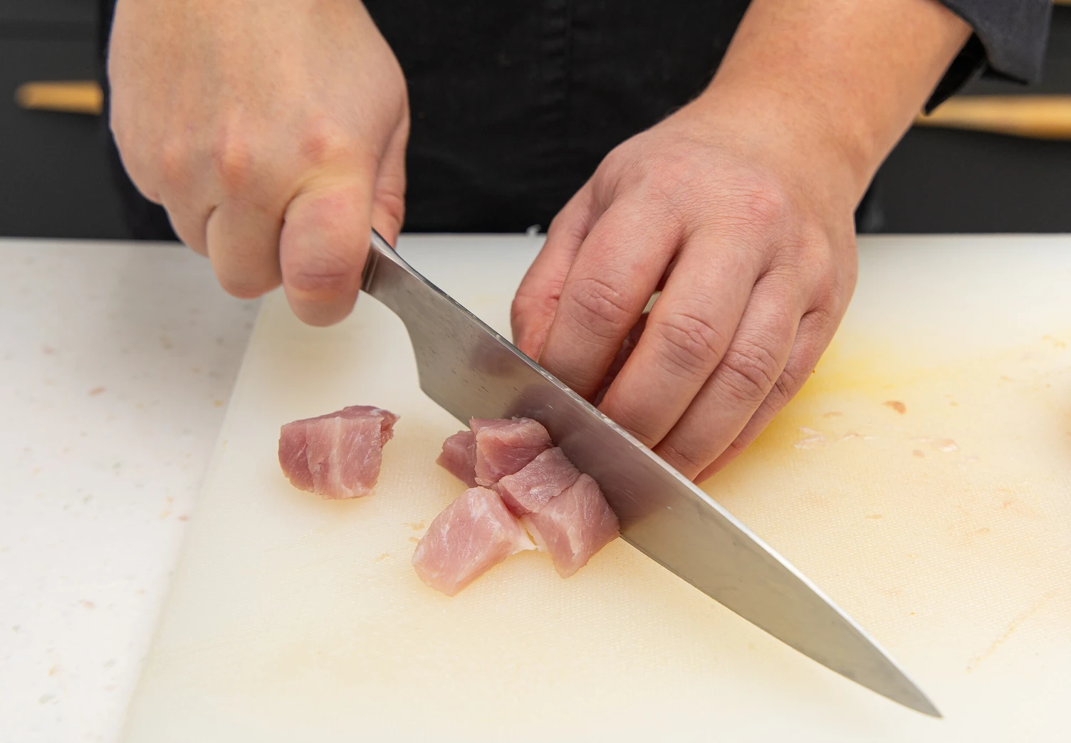 Нарежьте свинину, репчатый лук и морковь мелким кубиком (примерно 8x8 мм). Чеснок мелко порубите.