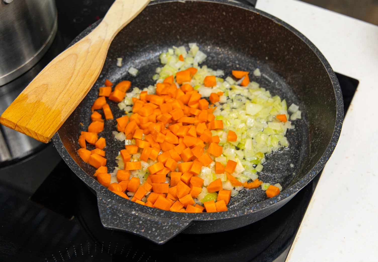 Выложите в сковороду лук с морковью и жарьте, помешивая, до образования золотистой корочки. Затем выньте и выбросьте лавровый лист.