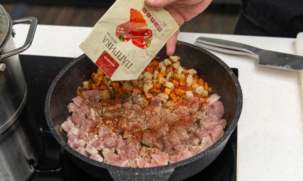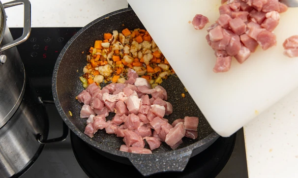 Добавьте в сковороду нарезанную свинину. Продолжайте жарить до образования золотистой корочки на мясе.