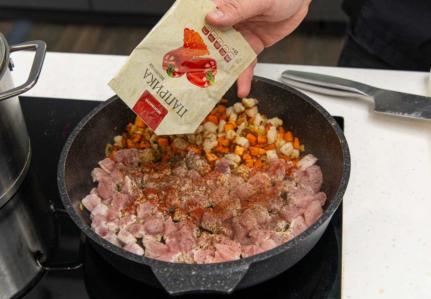 Всыпьте соль, мускатный орех и паприку по вкусу. Добавьте рубленый чеснок. Влейте в сковороду 120 мл воды и тушите содержимое, пока вся вода полностью не выпарится.