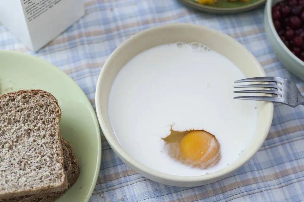 Молоко смешайте с яйцом, слегка взбейте вилкой и намочите в нем куски хлеба.