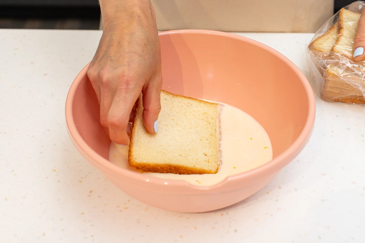 Обмакните кусочки хлеба в яично-молочную смесь.