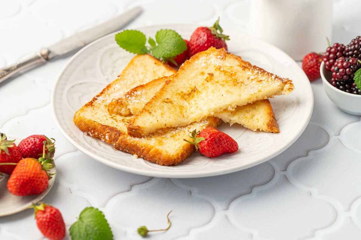Простые гренки из вчерашнего хлеба, как в детстве. Можно посыпать сахаром, а можно дополнить сгущёнкой или вареньем.