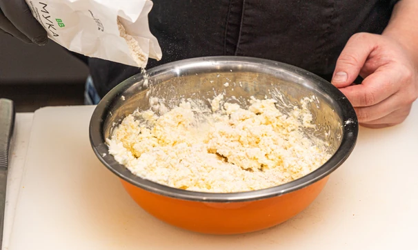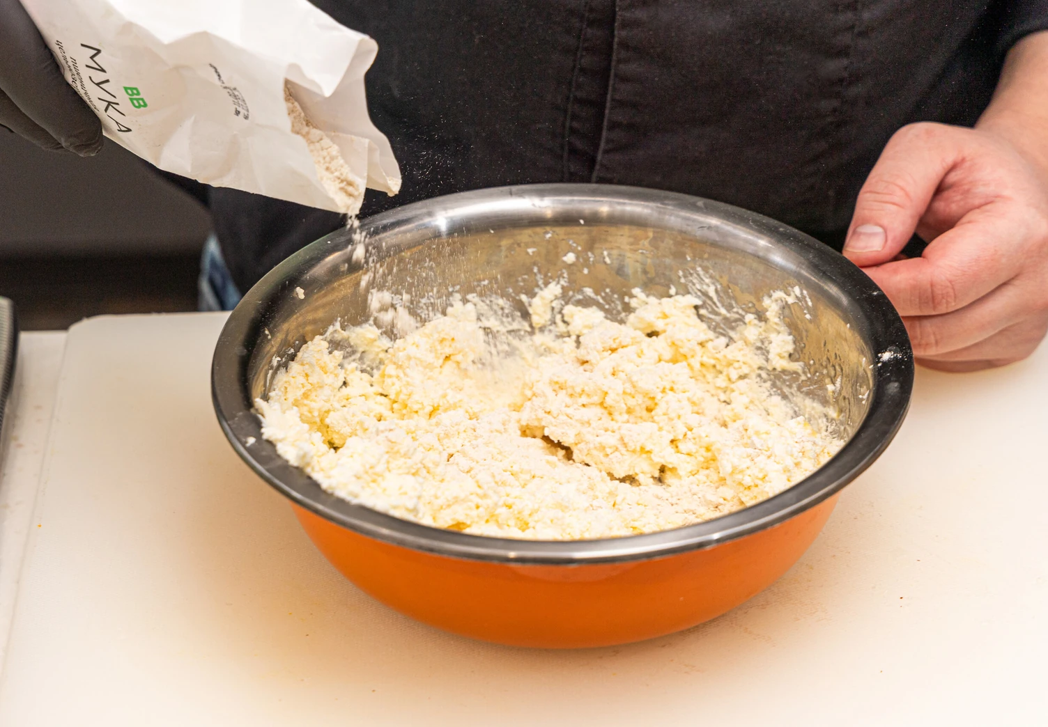 Творог разомните вилкой, добавьте одно яйцо, муку, соду и соль.