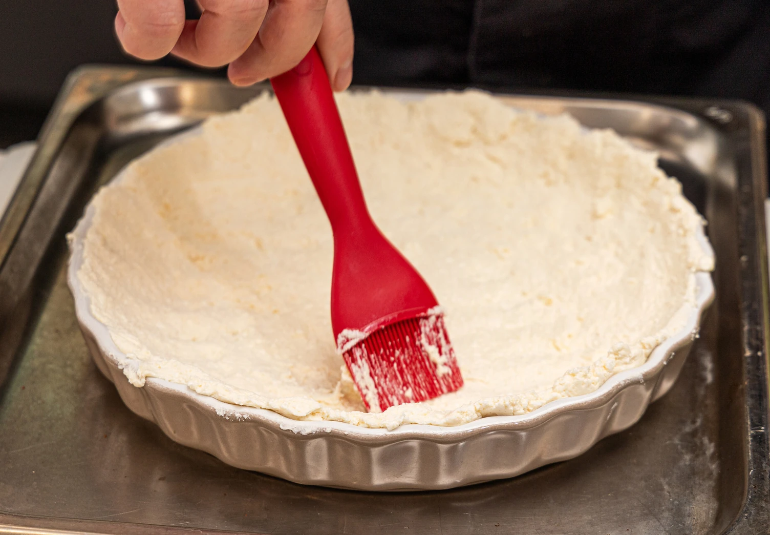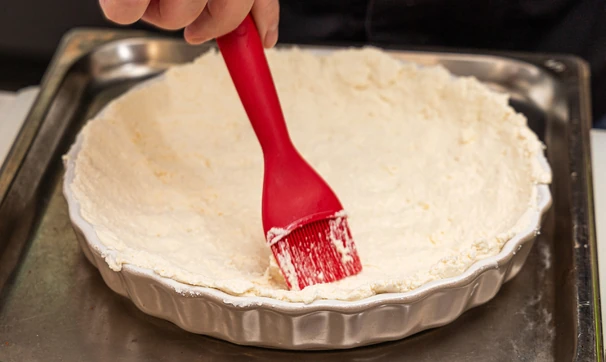 Хорошо перемешайте и выложите в смазанную маслом форму с бортиками. Выпекайте основу при 180 °C до золотистого цвета.