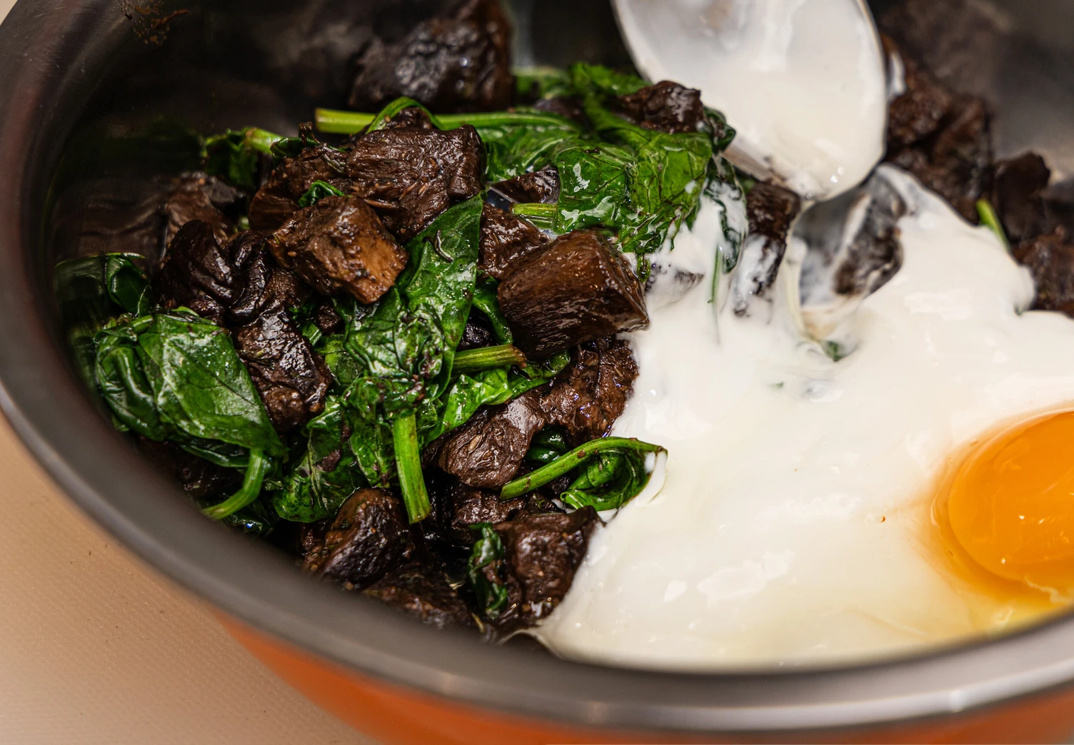 Смешайте грибную массу с яйцом и греческим йогуртом.