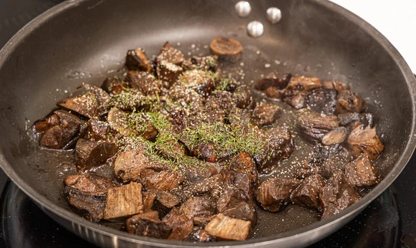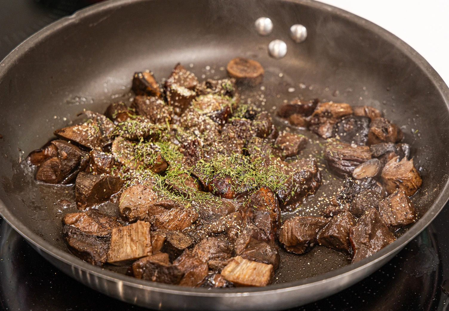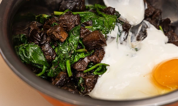 Обжарьте на капле масла грибы до готовности, в конце добавьте листья шпината и специи.