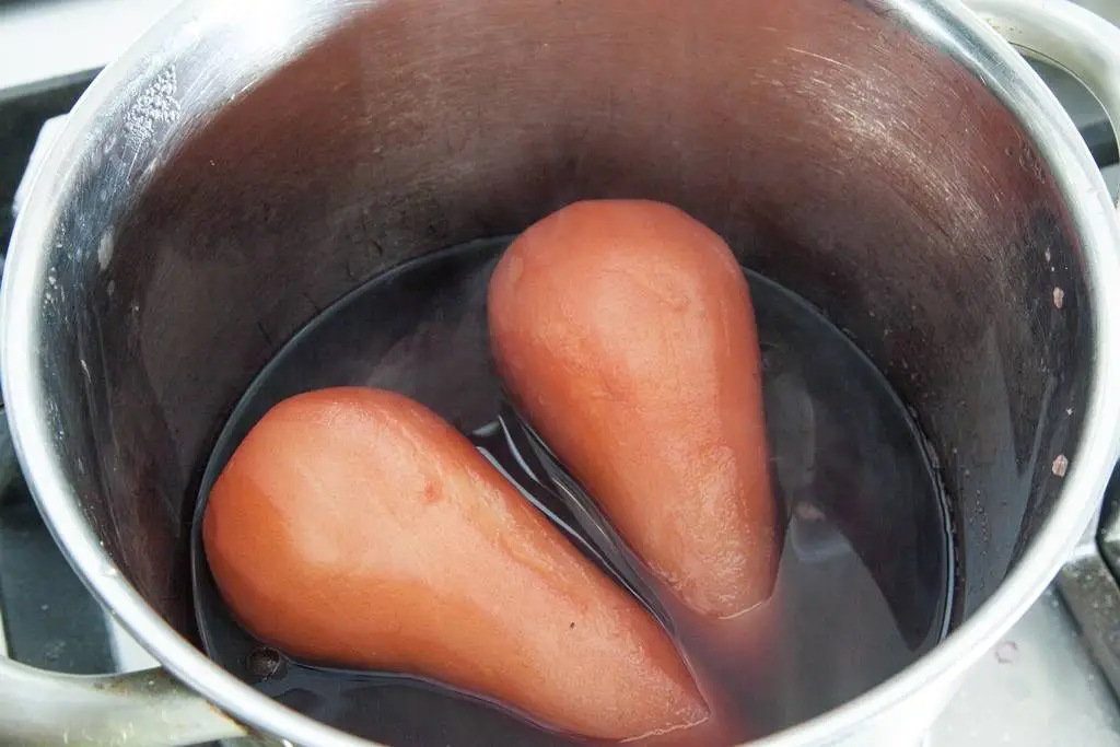 Положите в вино очищенные от кожуры груши и варите 30минут на слабом огне, выключите огонь и оставьте до полного остывания (можно оставить на ночь).