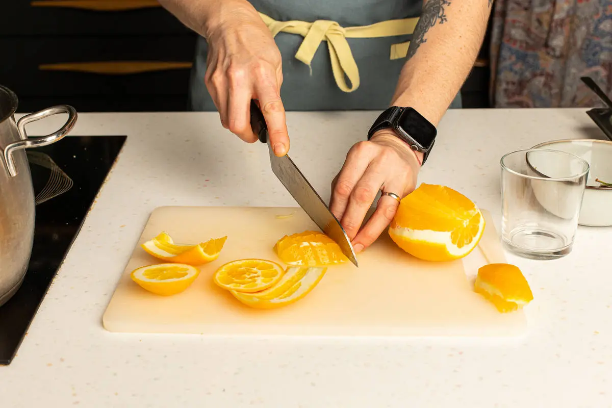 Апельсин очистите от кожуры и мелко нарежьте.