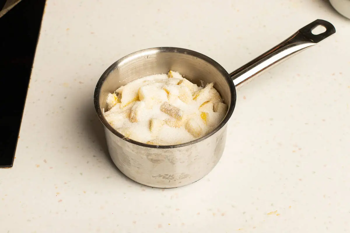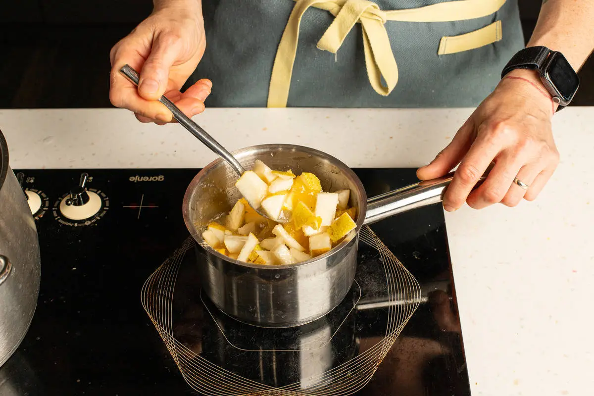 Сложите фрукты в кастрюлю, добавьте кардамон, засыпьте сахаром, перемешайте и оставьте на час, чтобы выделился сок.