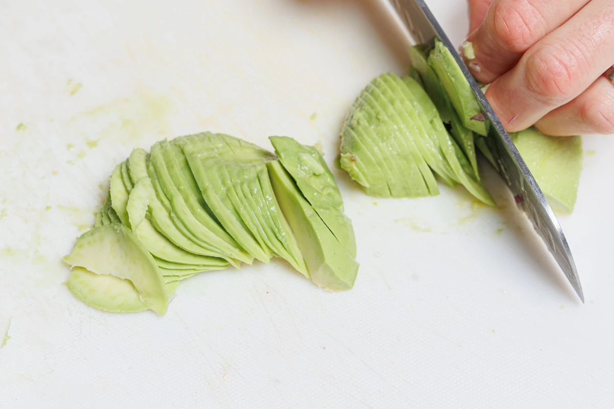 Авокадо разрежьте пополам. Очистите от кожуры и косточек. Нарежьте тонкими ломтиками и также положите в измельчитель. Если у вас очень мягкие авокадо, можно не измельчать их блендером, а просто размять вилкой.