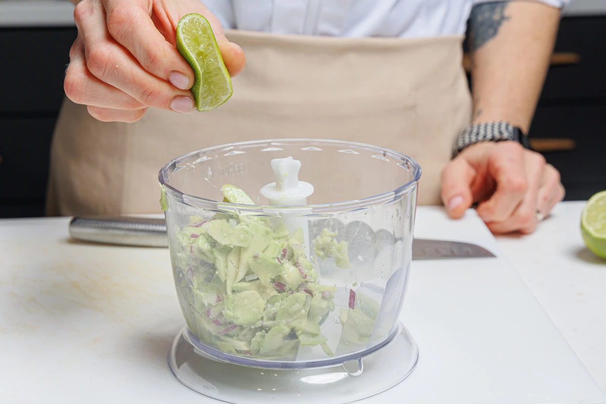 Добавьте сок половины лайма, соль, перец чили, оливковое масло.