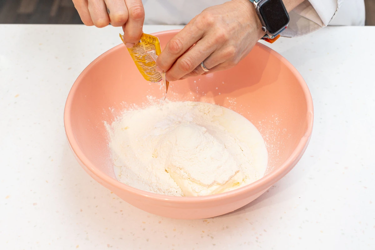 Положить в кефир разрыхлитель и перемешать.