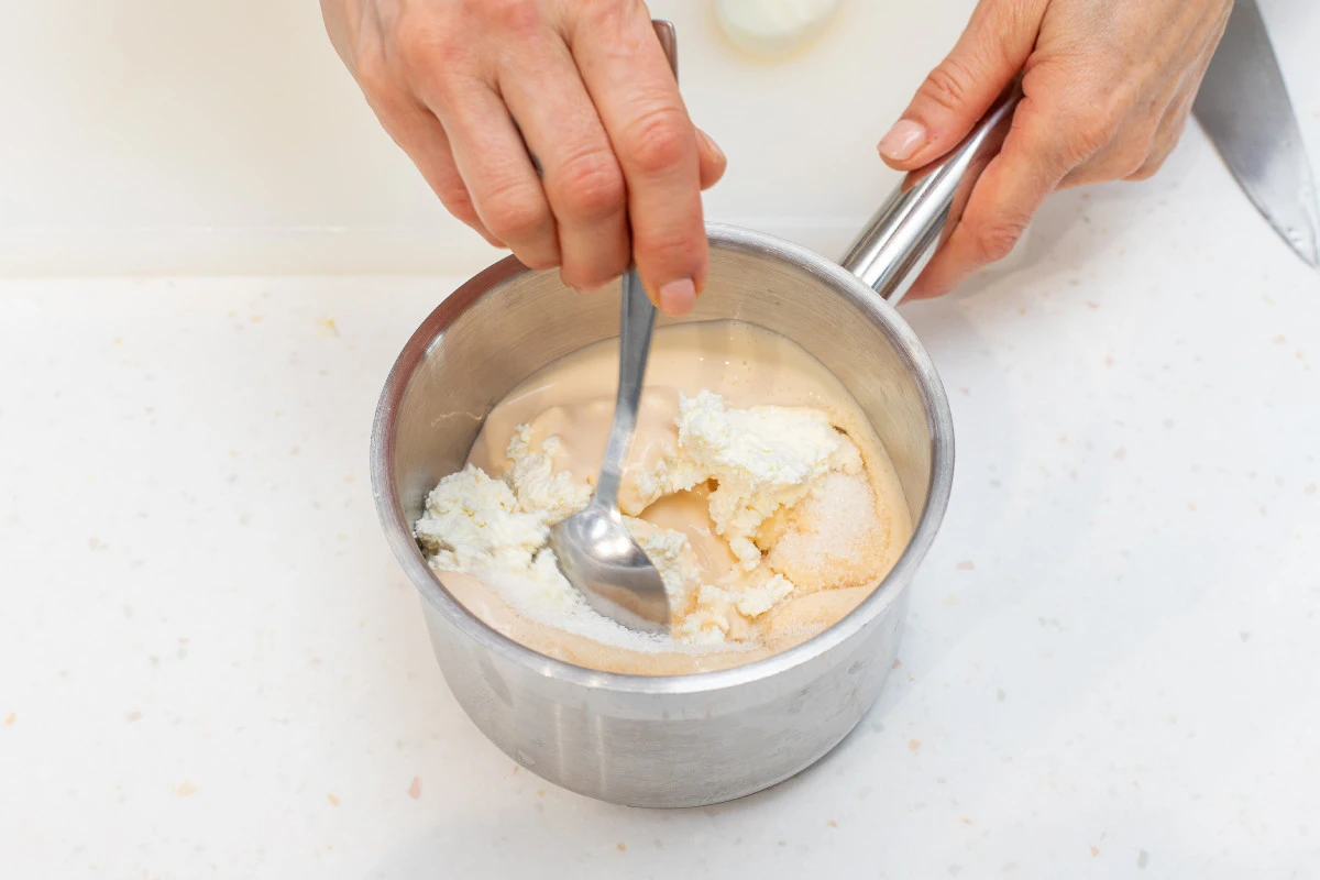 Для корта. Творог выложить в толстостенную посуду, залить ряженкой, добавить сахар. Томить на медленном огне около одного часа до получения однородной консистенции цвета топлёного молока и охладить.