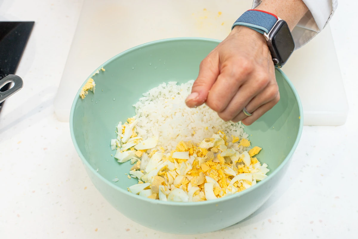 Нарезать кубиками яйца.