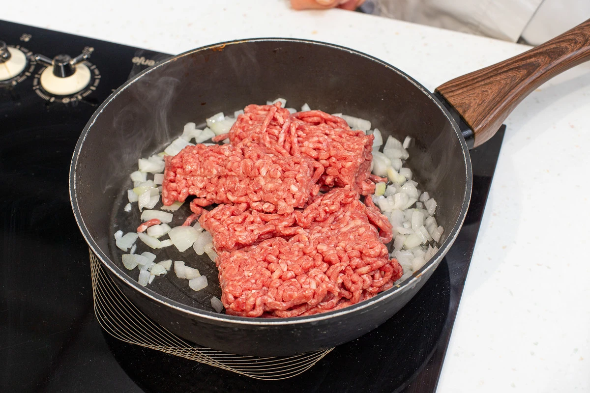 Обжарить мелко нарезанный лук вместе с фаршем, добавить соль и перец. Охладить.