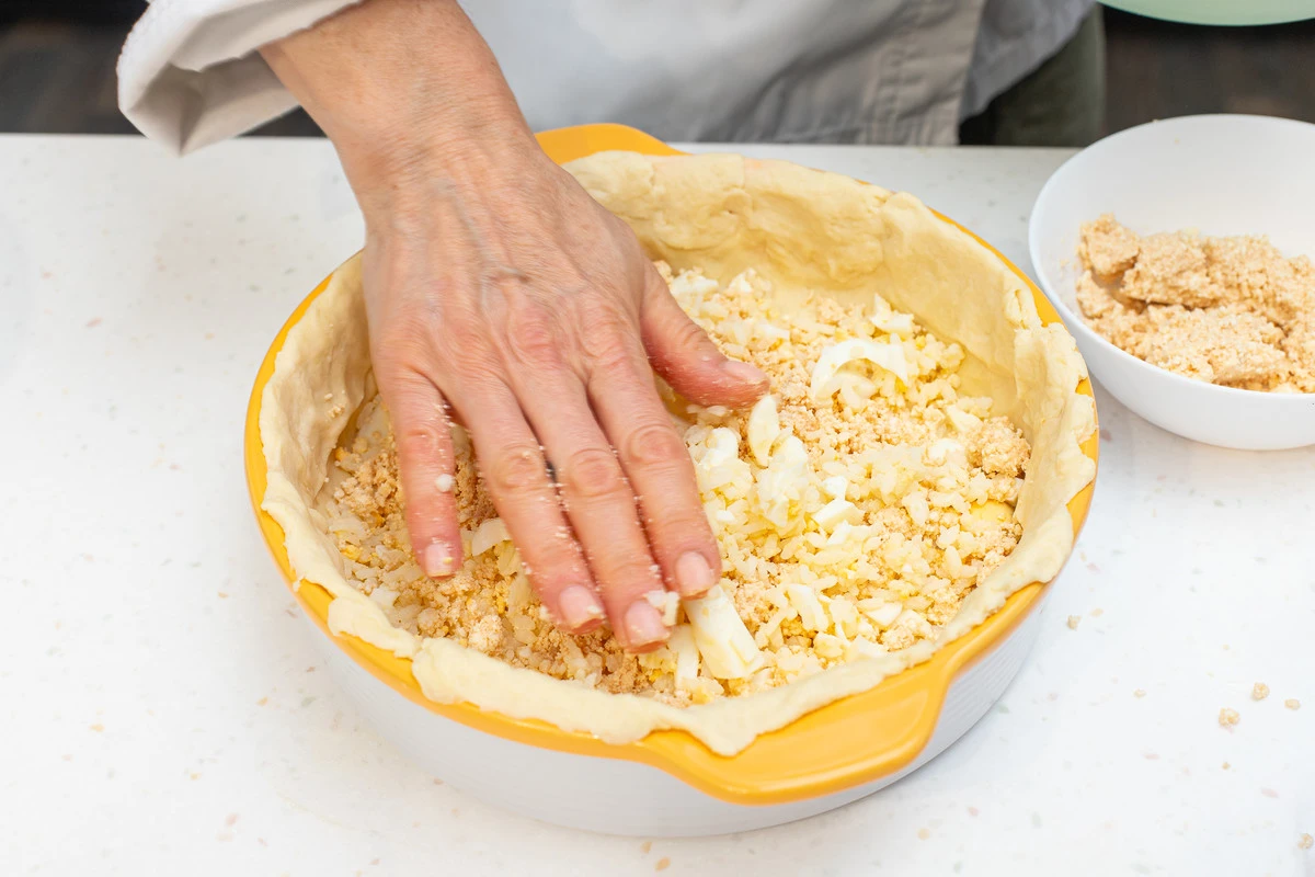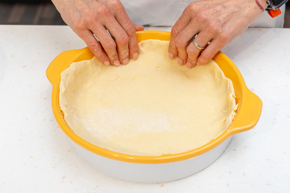 Разделить тесто на 2 части (2/3 для нижней части пирога, 1/3 для крышечки). Раскатать большую часть теста и выложить в толстостенную форму для выпекания, смазанную маслом.