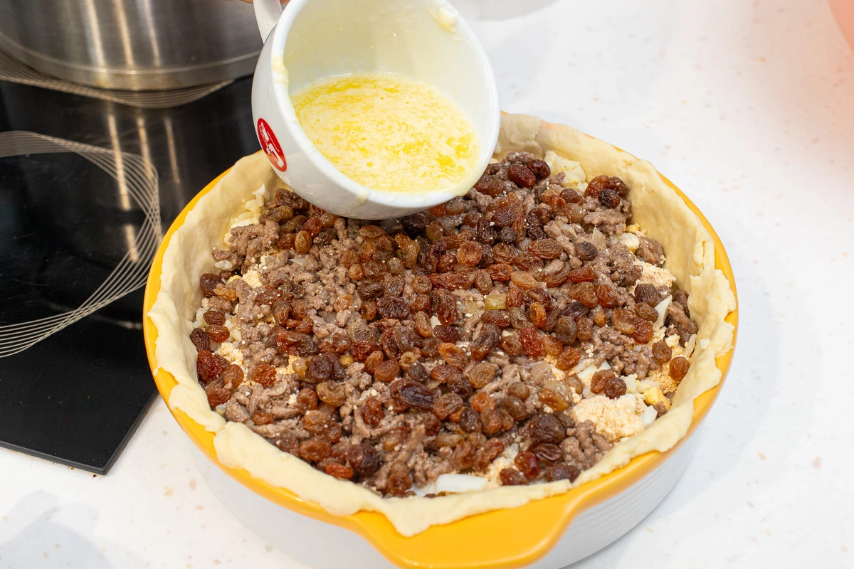Выложить начинку в такой последовательности: 1/3 риса — корт — 1/3 риса — фарш — яйца — 1/3 риса — изюм.