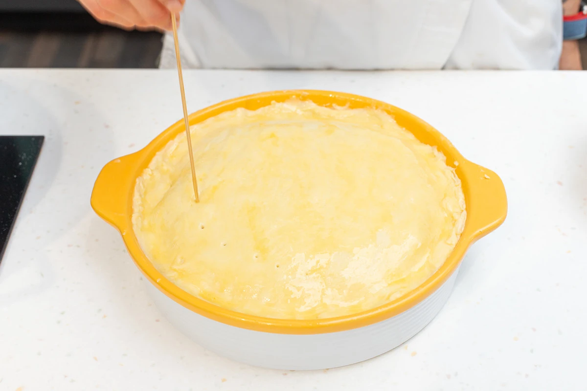 Смазать поверхность взбитым сырым яйцом, проткнуть в нескольких местах вилкой или зубочисткой и отправить в духовку. Выпекать около 50 минут при температуре 180 градусов.