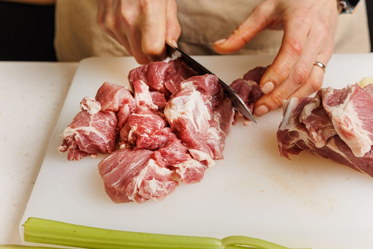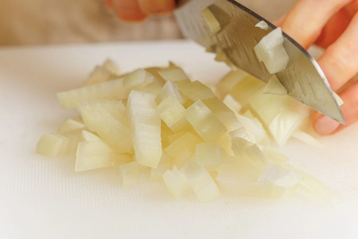 Лук и стебли сельдерея нарежьте кусочками среднего размера.