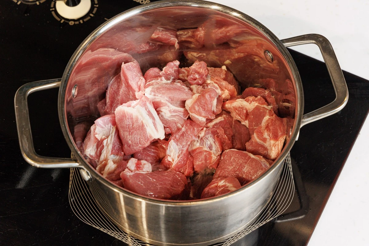 В большую кастрюлю налейте масло, разогрейте, выложите мясо. Через несколько минут посолите по вкусу и готовьте в общей сложности 10–15 минут до образования золотистой корочки. Периодически помешивайте.