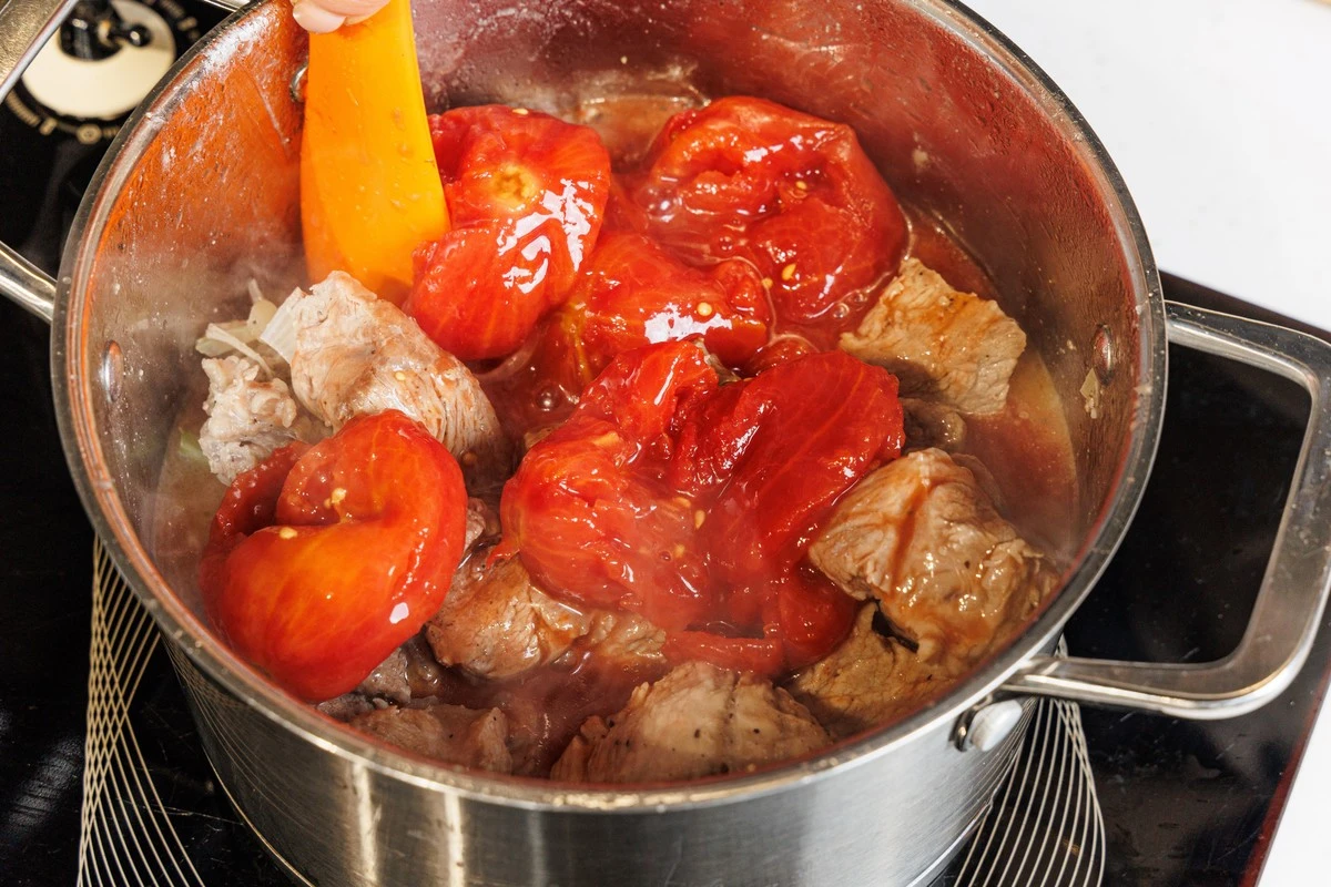 Выложите в кастрюлю томаты в собственном соку вместе с соком.