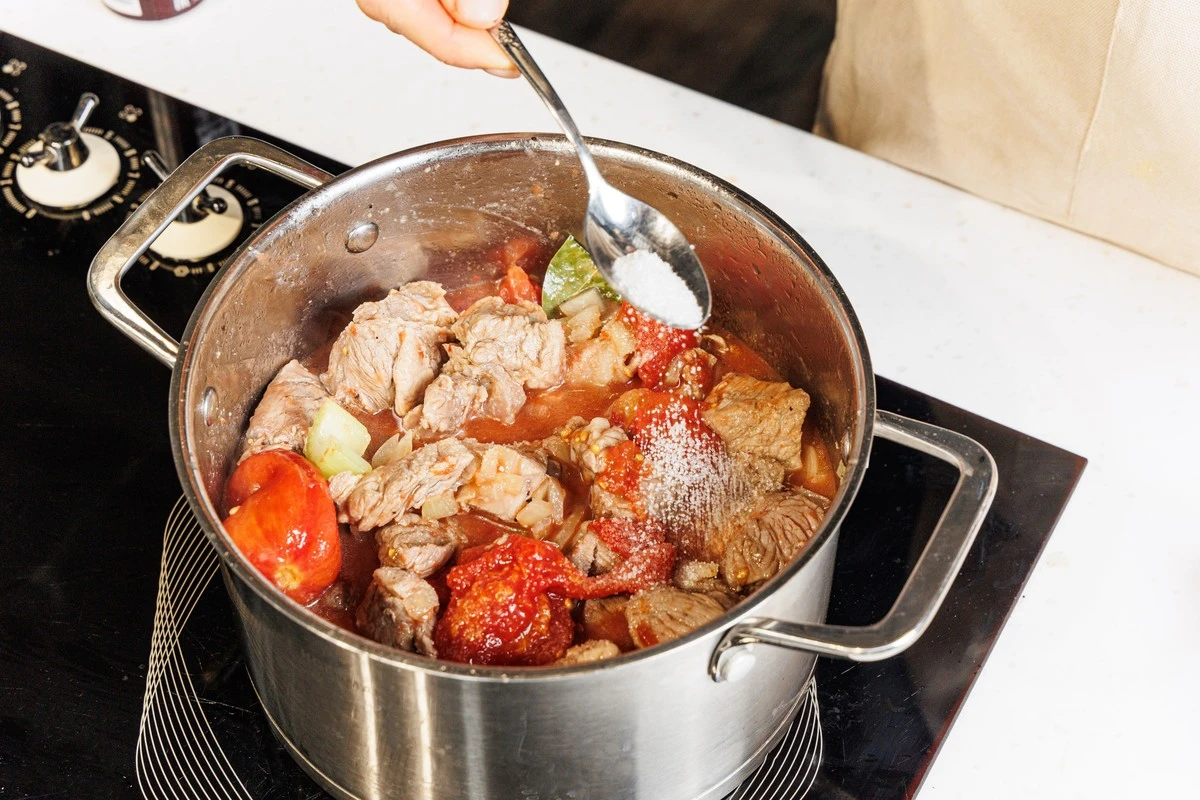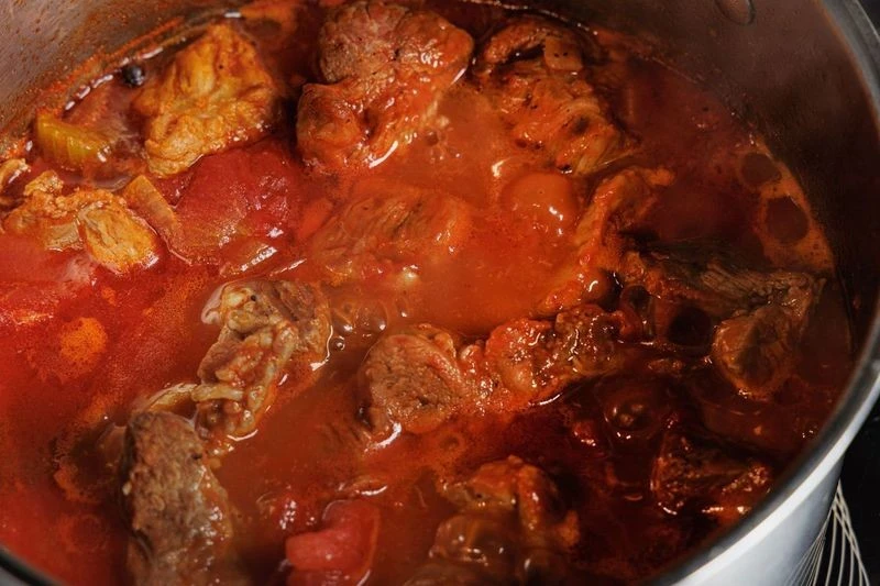 Тушите на медленном огне 40–45 минут. Если вдруг жидкость выкипит или вы любите более жидкий соус, добавьте немного воды.