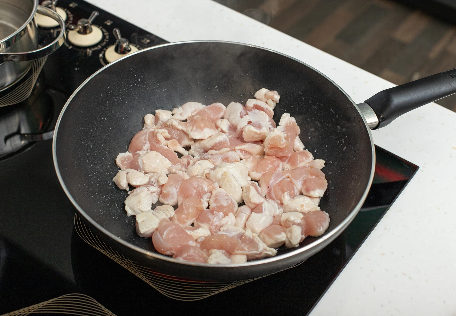 На раскалённом растительном масле обжарьте филе цыплёнка на сильном огне в течение 2–3 минут.