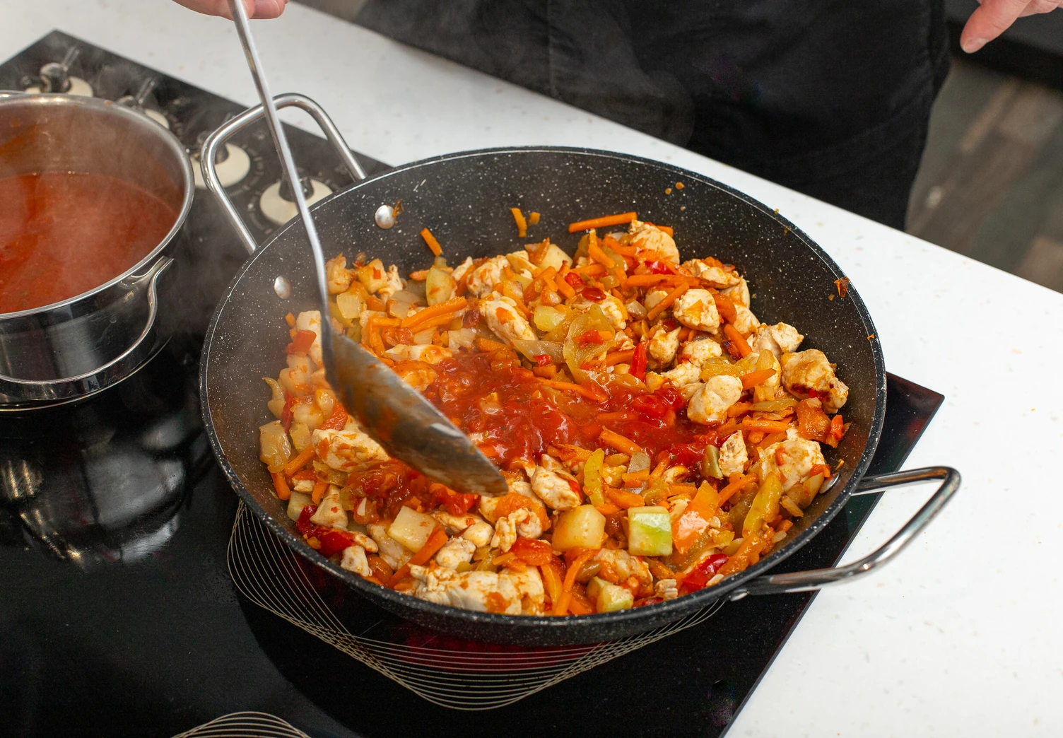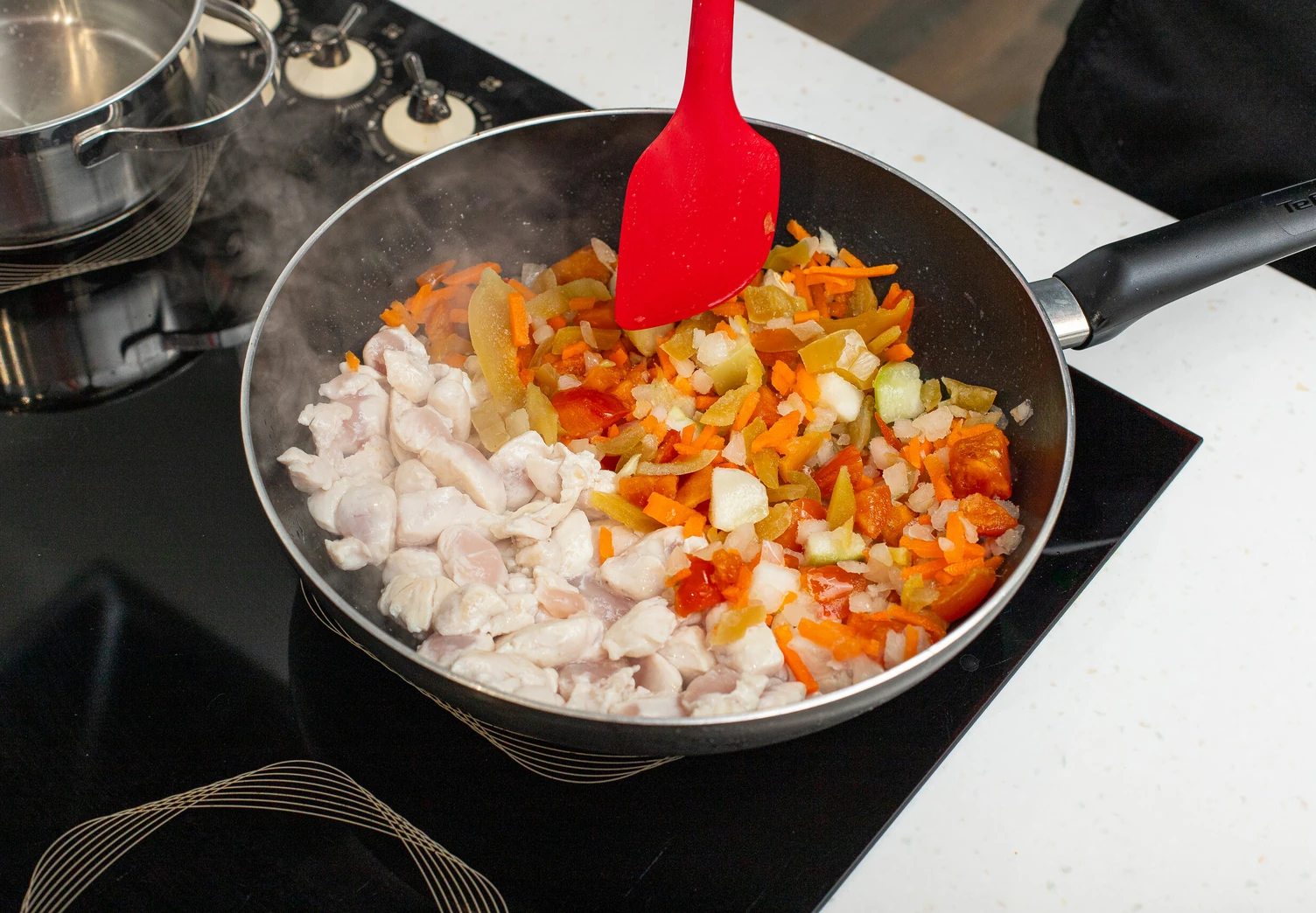 Добавьте овощную смесь и жарьте ещё 3–4 минуты. Дополните специями по вкусу.