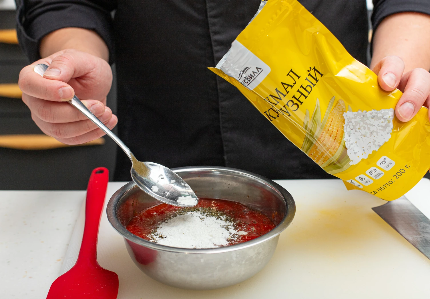 Крахмал смешайте с томатами в собственном соку и лавровым листом.