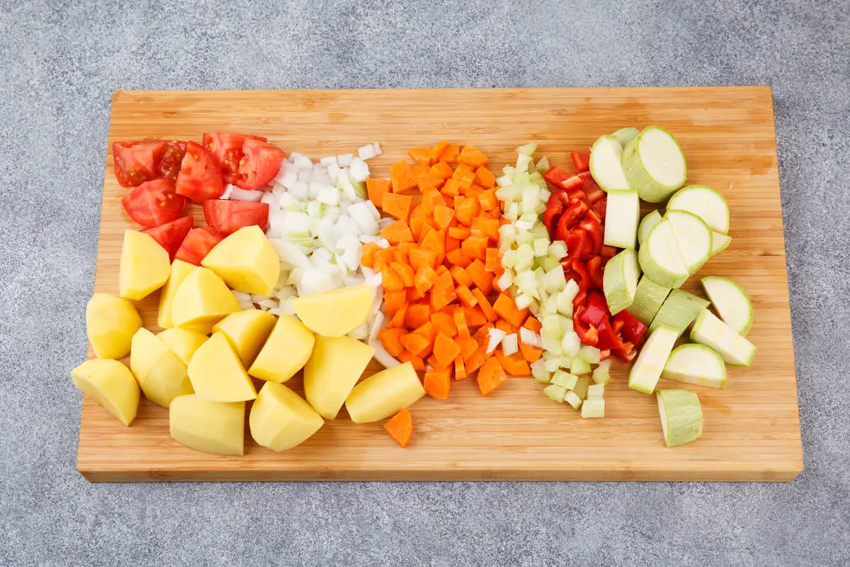 Картофель и лук очистите. Картофель и помидор нарежьте крупными кубиками, цукини — толстыми кружочками, остальные овощи — мелкими кубиками. Чеснок и зелень мелко порубите.