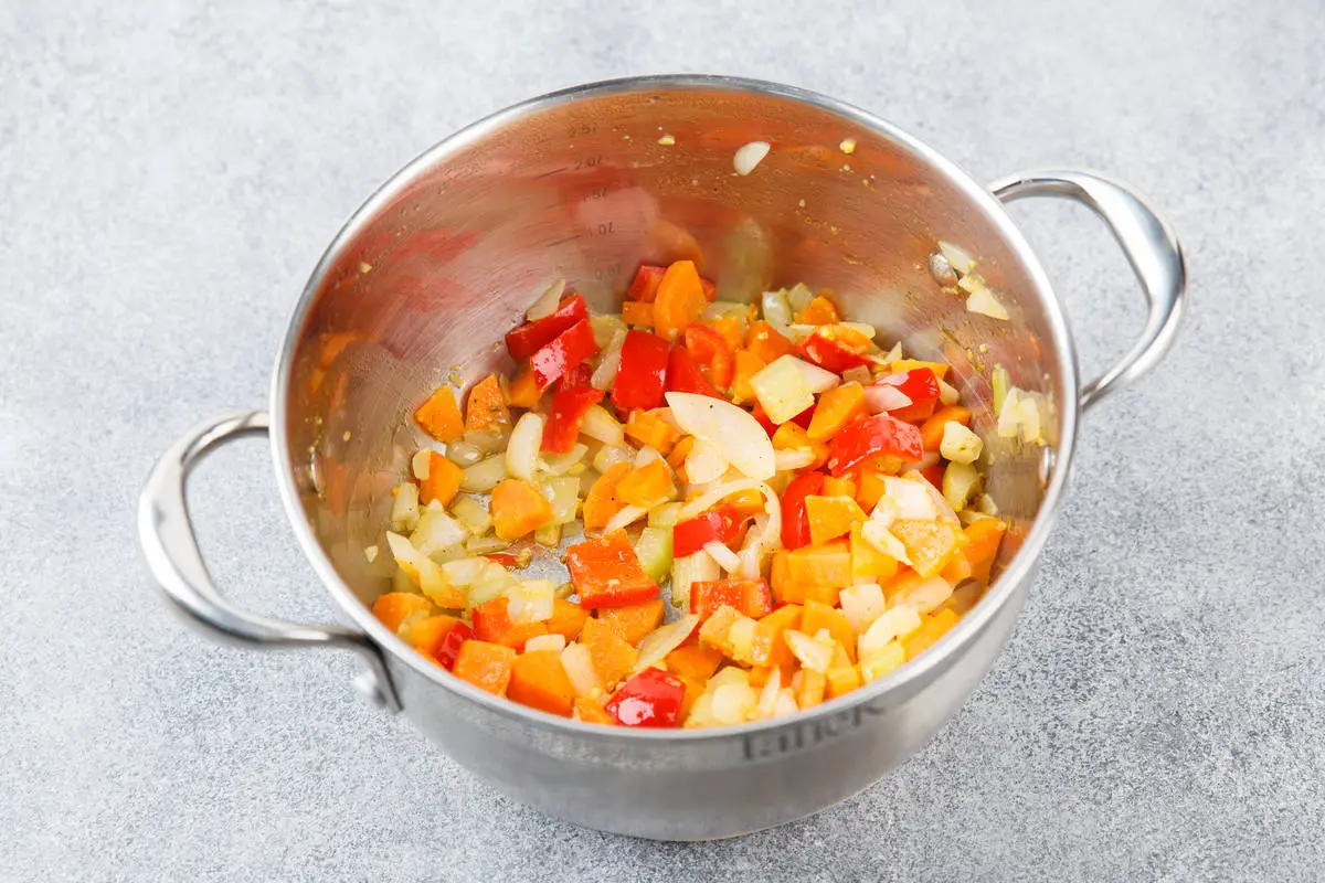 Обжарьте на оливковом масле в кастрюле или глубокой сковороде лук, чеснок, сельдерей, морковь и перец. Добавьте картофель, помидор и кабачок, посолите, добавьте приправу.