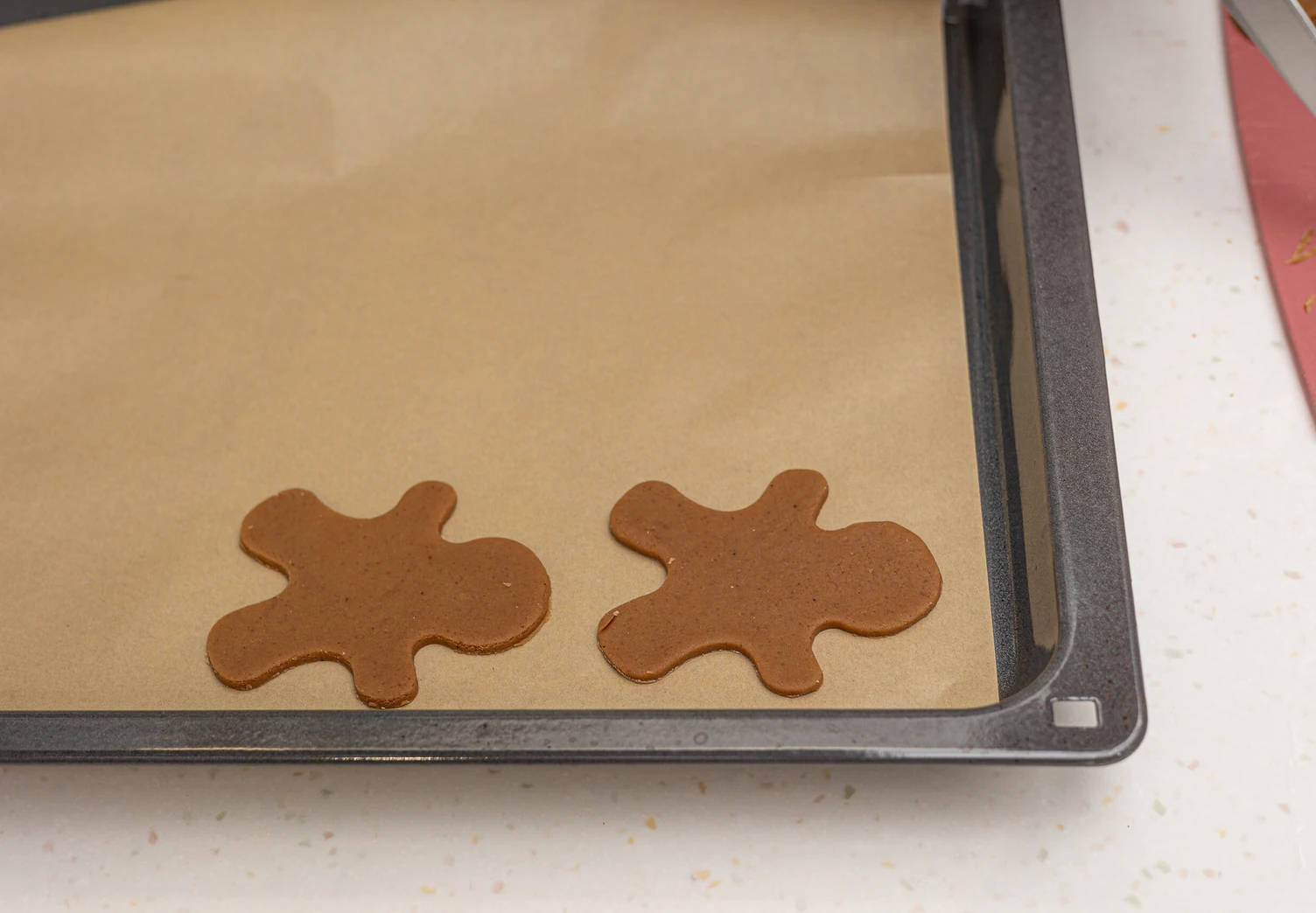 Выложите фигурки на противень, застеленный пергаментом. Выпекайте 12-14 минут в духовке, разогретой до 190°C. Готовому печенью дайте немного остыть на противне, затем переложите на тарелку или решётку и остудите полностью.