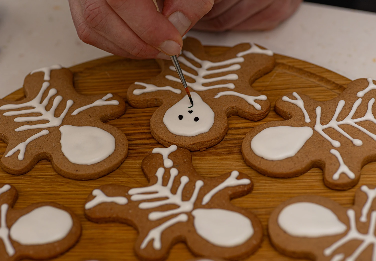Дайте глазури полностью застыть. Чёрный пищевой краситель разведите в небольшом количестве воды или водки и нарисуйте при помощи тонкой кисточки рожицы на скелетах.
