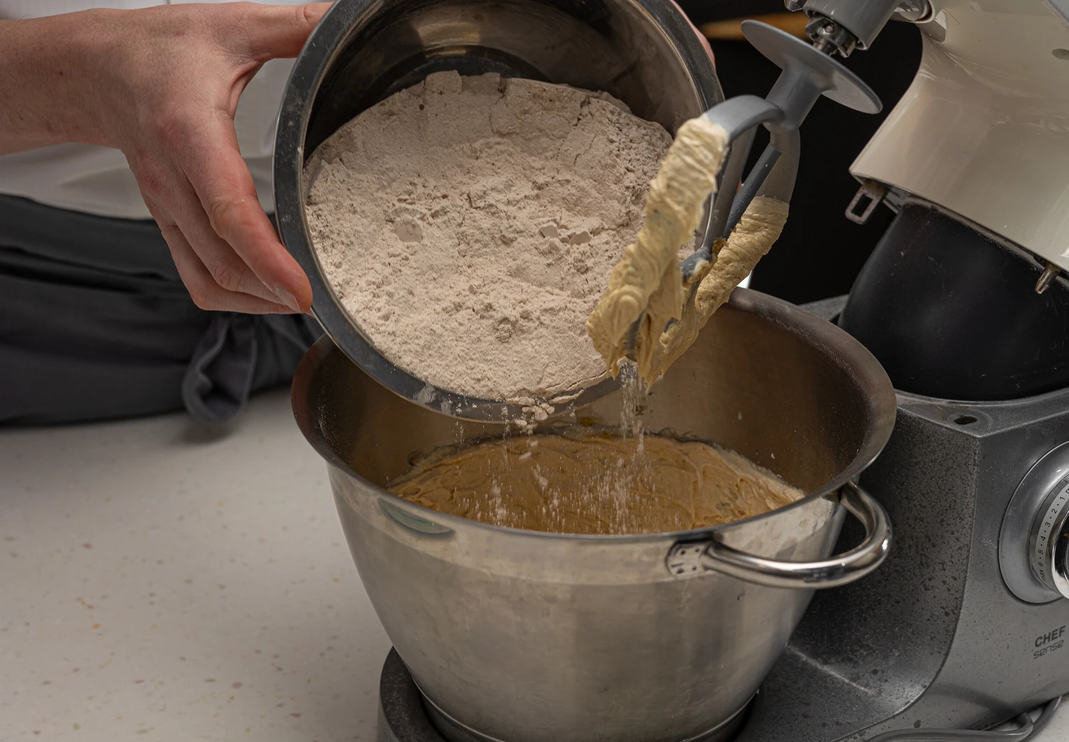 Добавьте к масляно-яичной смеси кленовый сироп, молоко и сыпучие ингредиенты.