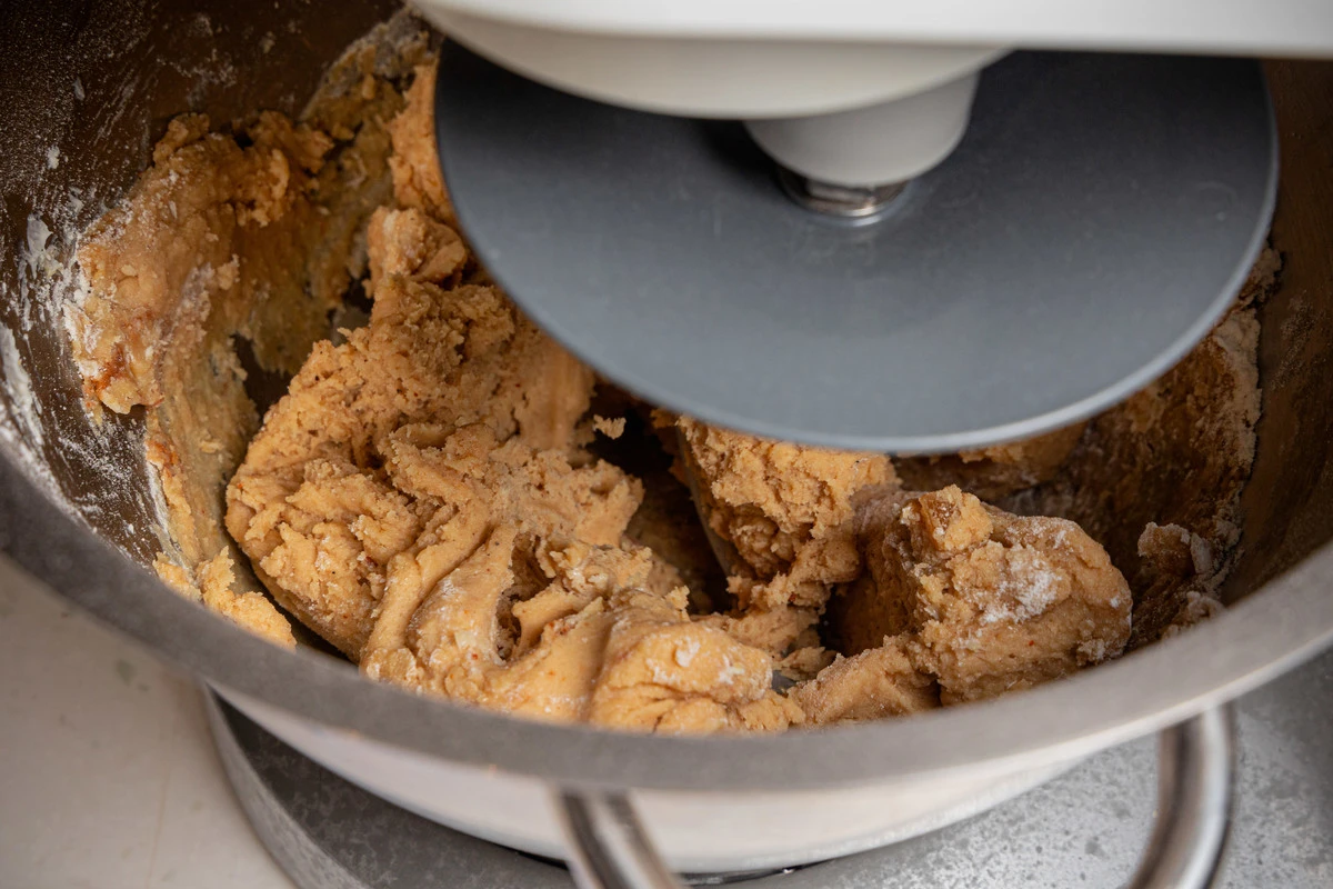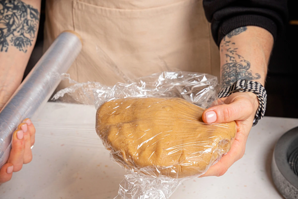 Мелко нарежьте засахаренный имбирь и добавьте в тесто. Достаньте тесто из чаши миксера, обомните его руками, заверните в пищевую плёнку и оставьте на 20 минут отдохнуть. А затем уберите в холод на 1 час.