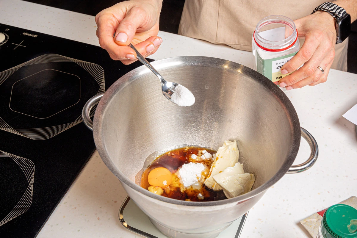 Налейте кленовый сироп и добавьте яйцо. Насыпьте соль, соду, корицу, кардамон, имбирь, мускатный орех.
