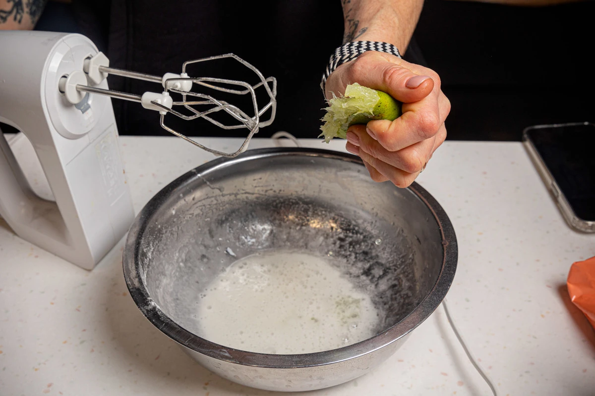 Сделайте глазурь. Слегка взбейте миксером яичный белок. Добавьте сахарную пудру и взбейте ещё раз. Добавьте немного сока лайма по вкусу и перемешайте до однородности.