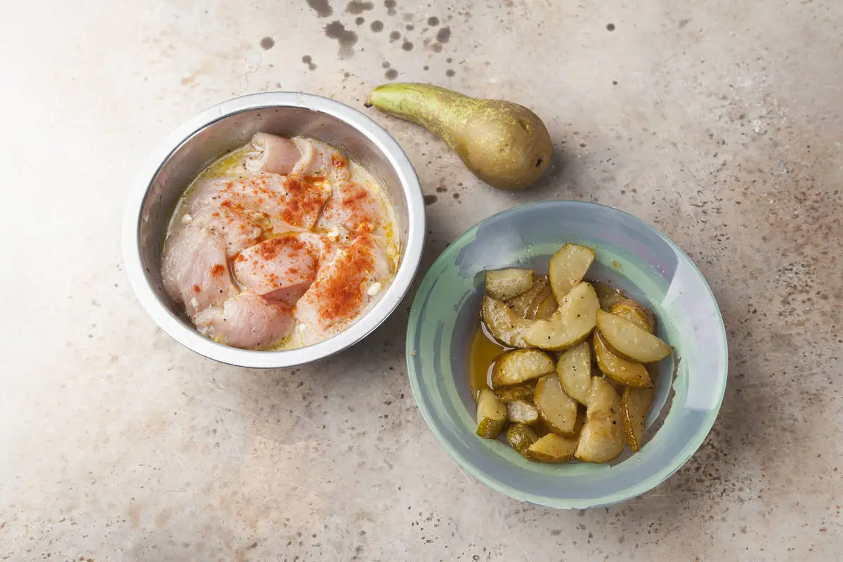Индейку нарежьте слайсами толщиной 2-3 см, замаринуйте в сидре на 2-3 часа.