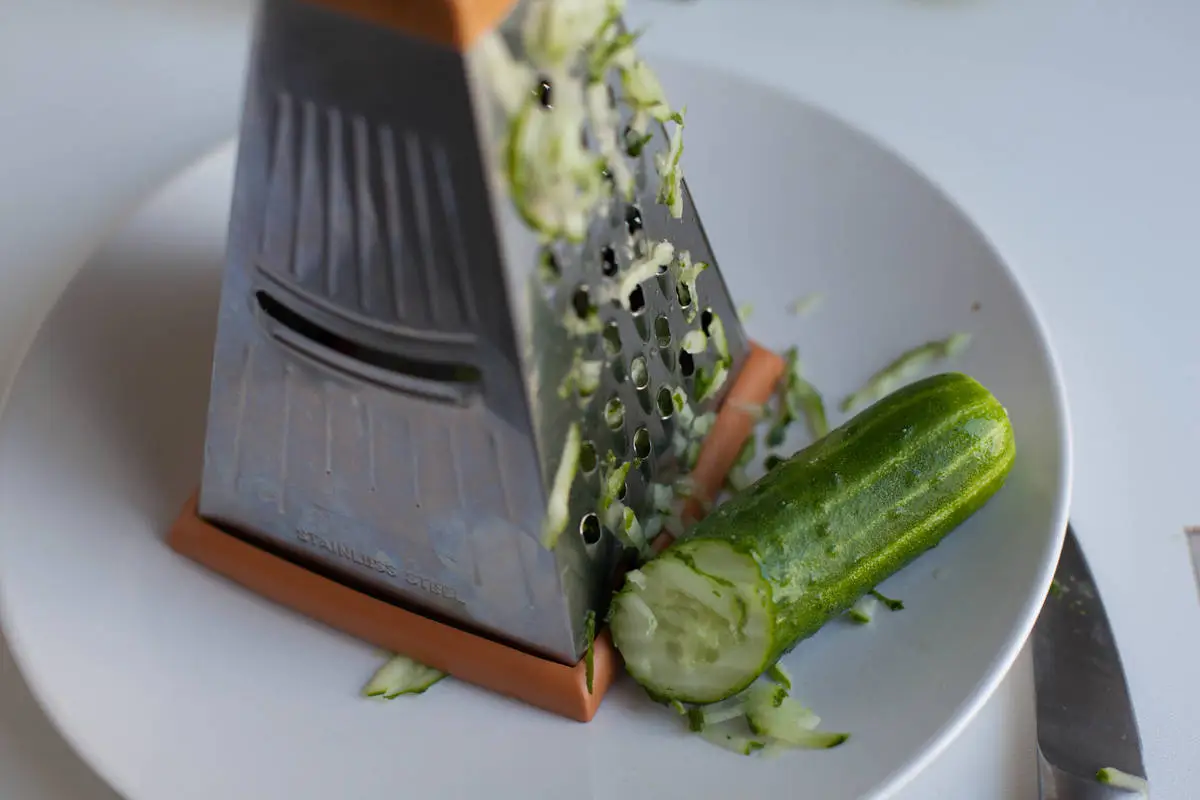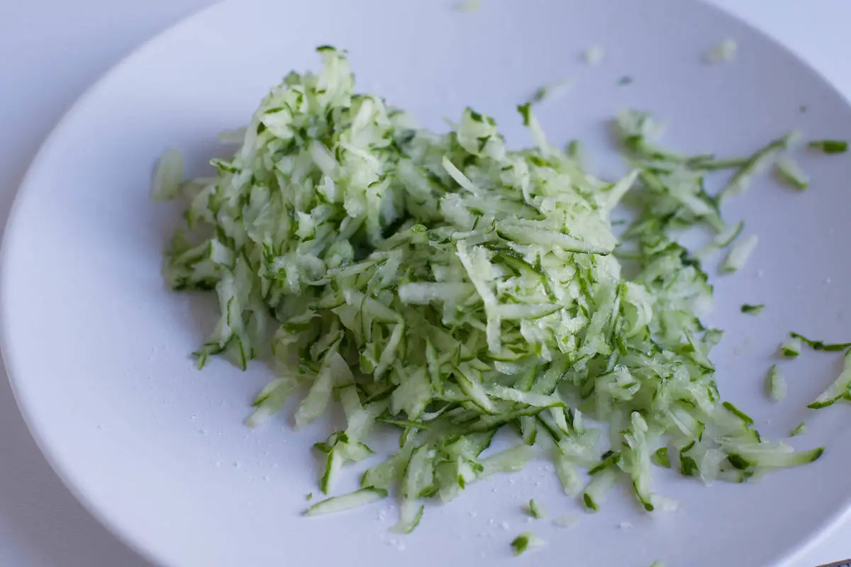 Огурцы натрите на средней терке, посолите и оставьте на 5 минут, слейте выделившийся сок, слегка отожмите.