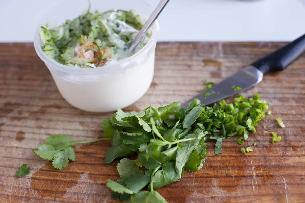 Смешайте огурец с йогуртом, добавьте соль по вкусу, специи и зелень.