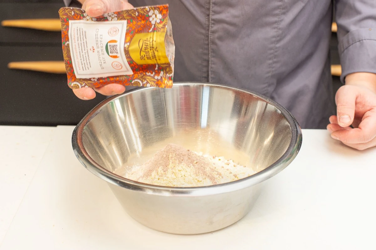 Насыпьте муку обоих видов в миску. Добавьте молотый красный лук, соль, сахар и перемешайте.