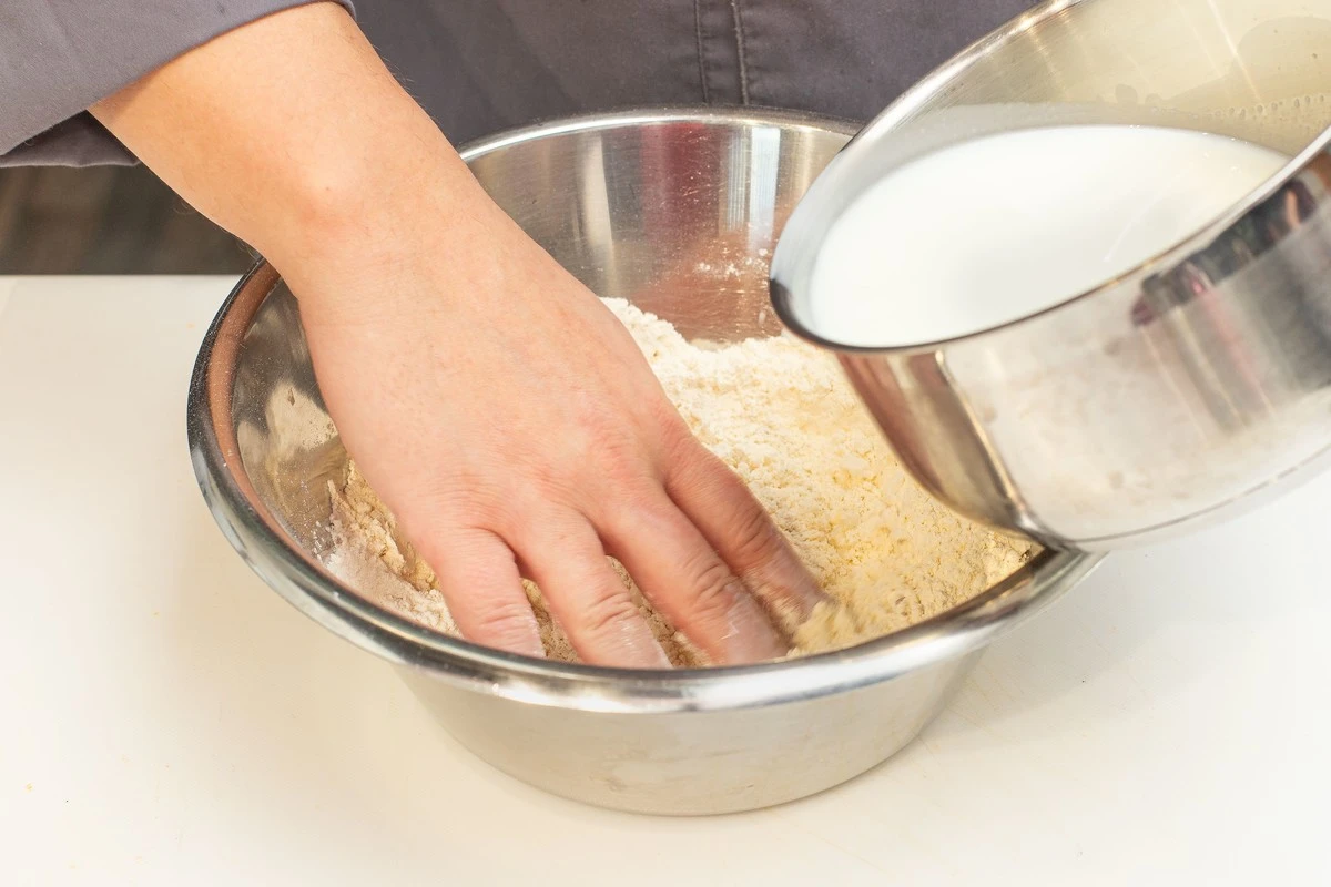 Влейте порциями тёплое молоко и замесите тесто. Вымешивайте до однородности и эластичности, пока оно не перестанет прилипать к рукам.