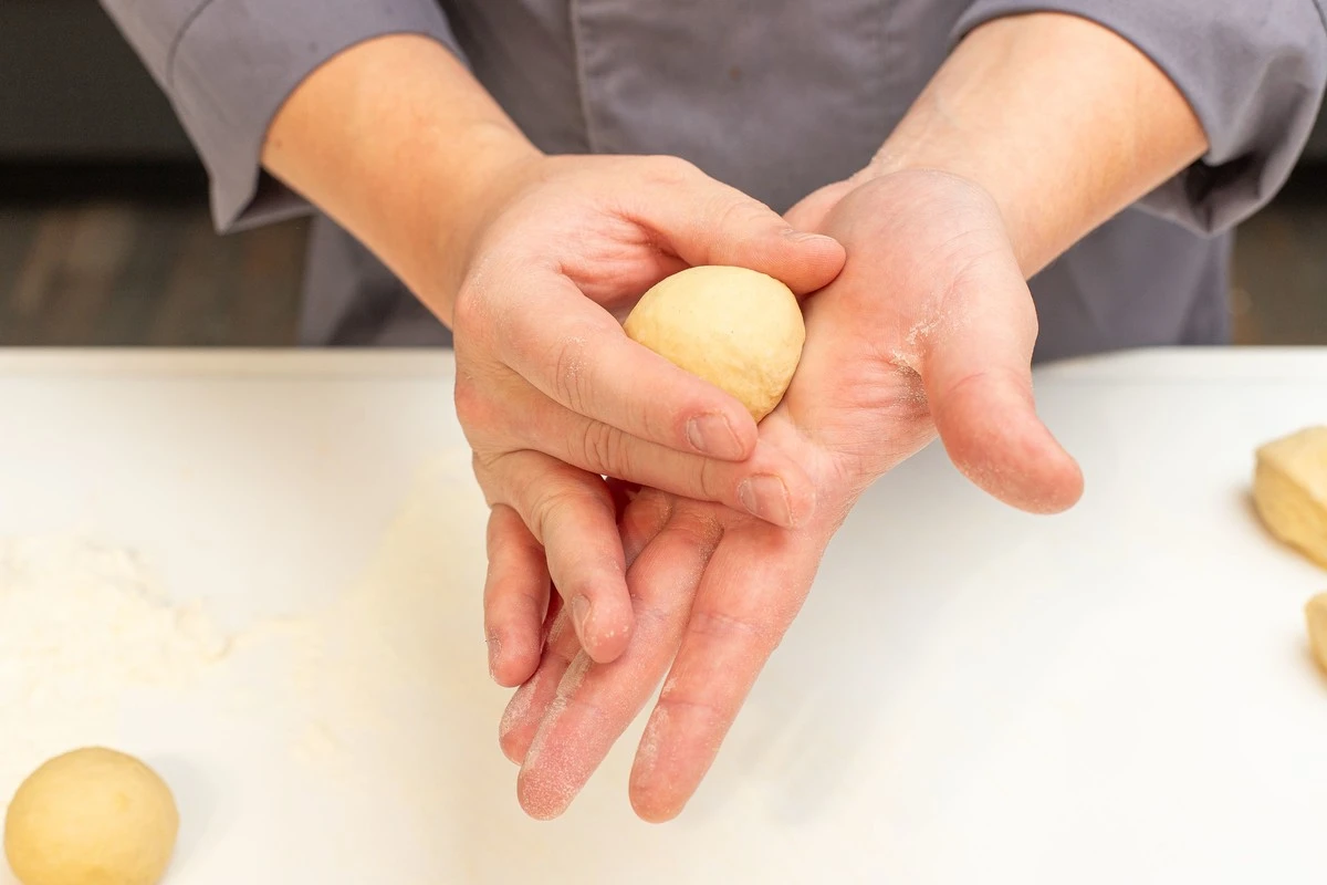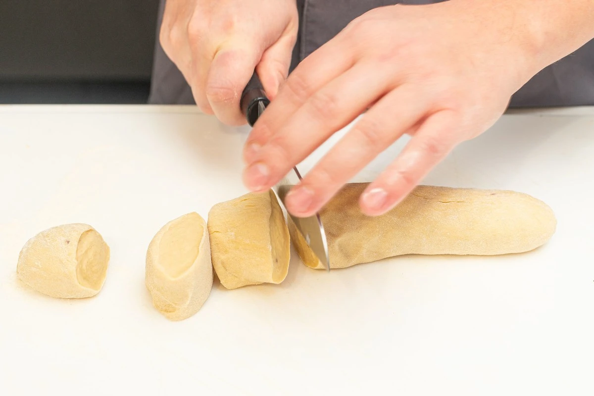 Припылите рабочую поверхность мукой. Сформируйте из теста колбаску, нарежьте на равные кусочки толщиной примерно 4–5 см.